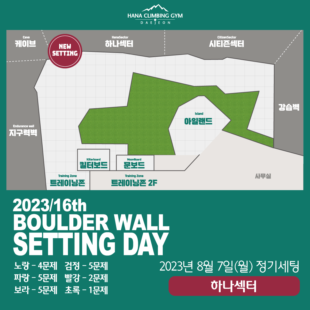 ‼날씨가 엄청 덥습니다!! 2023년 열여섯번째 볼더링 정기세팅 안내드립니다! 이번세팅구역은 케이브가 있는 하나섹터 입니다. 하나섹터는 오버행벽이라 시티즌섹터보다 어렵게 느끼시는 분들이 많아요. 도전해보세요!!????????????
