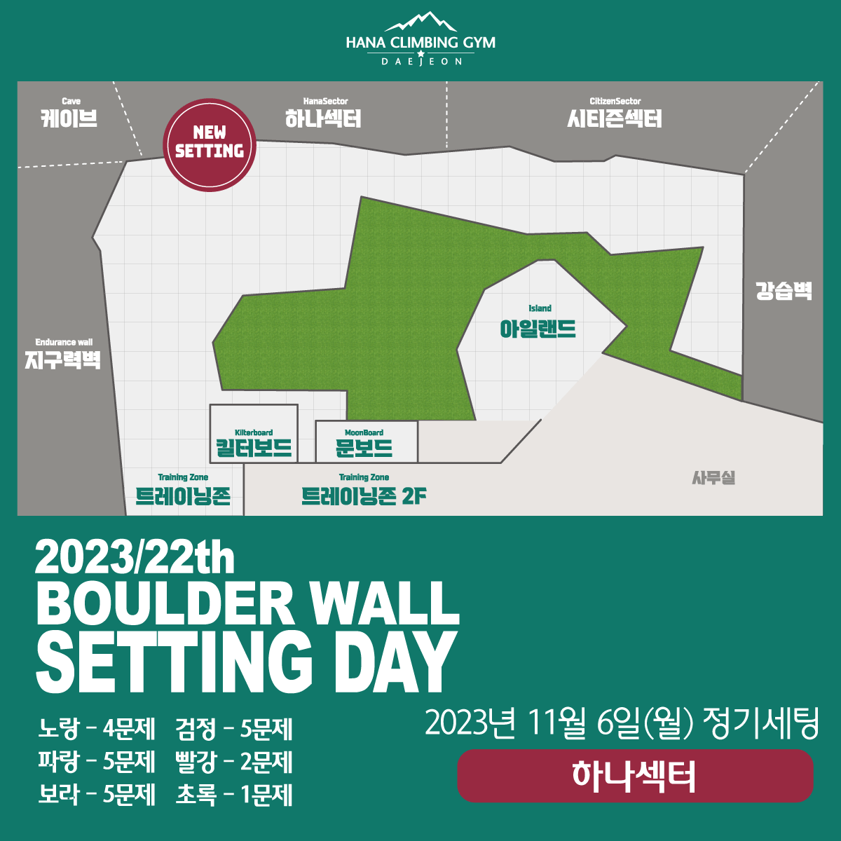 ‼날씨가 갑자기 완전히 쌀쌀해 졌네요. 등잔하기 좋은 계절입니다! 2023년 스물두번째 볼더링 정기세팅 안내드립니다! 이번세팅구역은 케이브가 있는 하나섹터와 아일랜드 입니다. 항상 강력한 하나섹터 케이브에 있는 문제들에 도전해보세요!!????????????