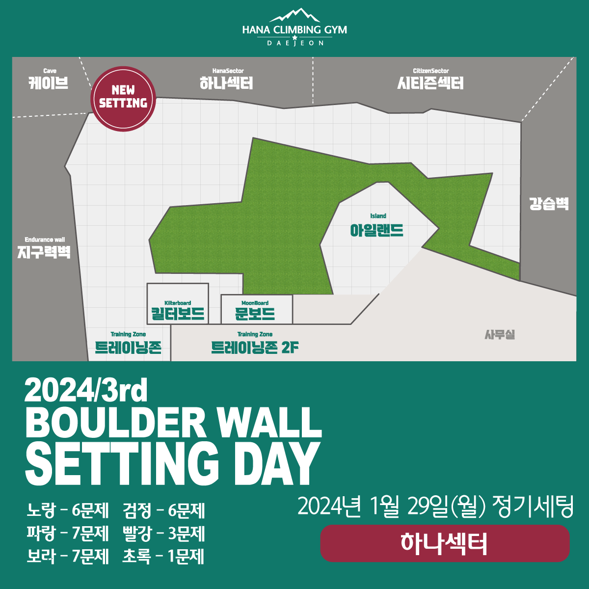 2024년 세번째정기세팅 소식 전해드립니다.이번세팅부터 볼더링 문제수가 추가되었고 볼더링 구역도 조정이 있었습니다